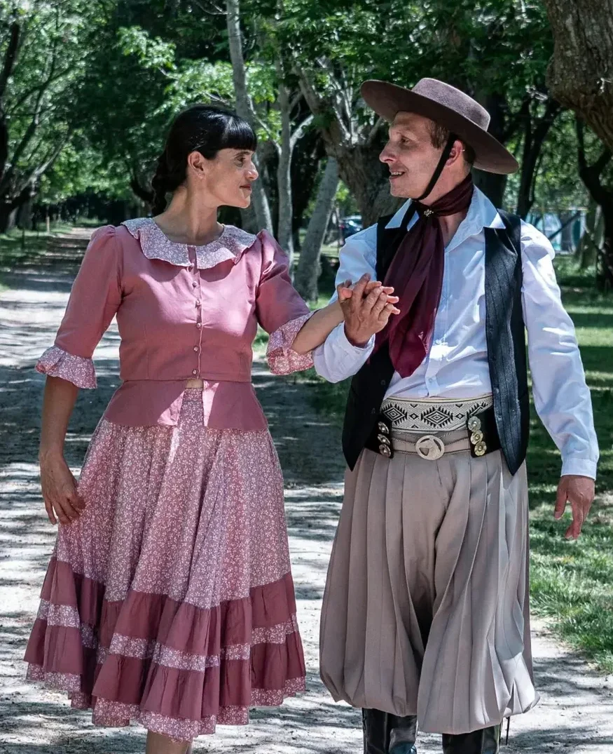 Aunque Argentina no tiene un traje típico nacional como otros países, la figura del gaucho se convirtió en un símbolo que representa la identidad nacional. El gaucho es un hombre de campo, experto en la monta de caballos y en el trabajo rural. Su vestimenta tradicional incluye bombachas (pantalones), camisa, sombrero de ala ancha y botas de cuero, y está asociada con la imagen clásica del argentino de campo. Muchas personas todavía se inspiran en este estilo, especialmente en las zonas rurales.